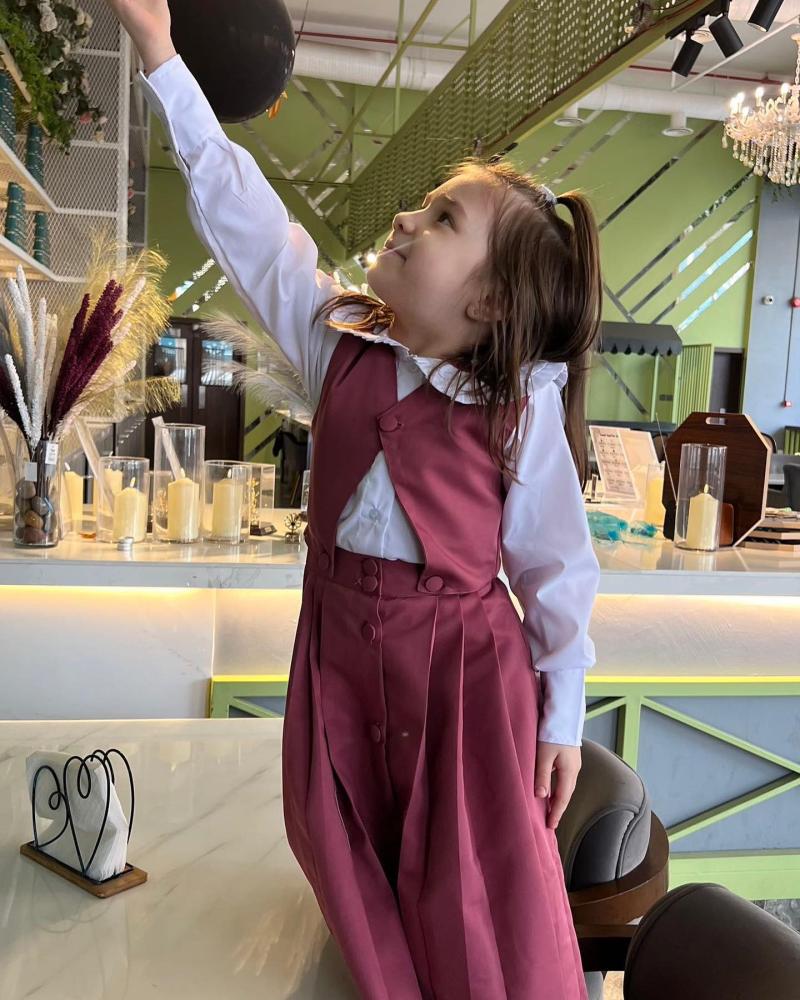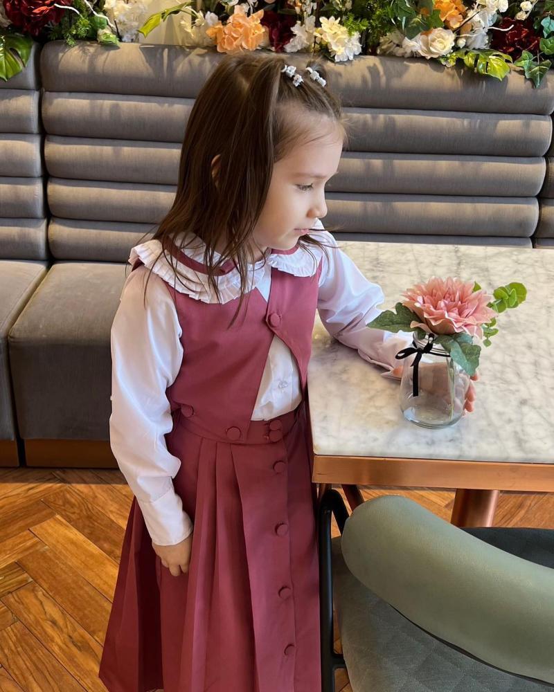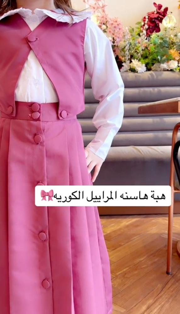 صمم بثلاث قطع بلون وردي بتصميم فتحة رقبة ناعمة ومزينه مع قميص منفصل بلون ابيض